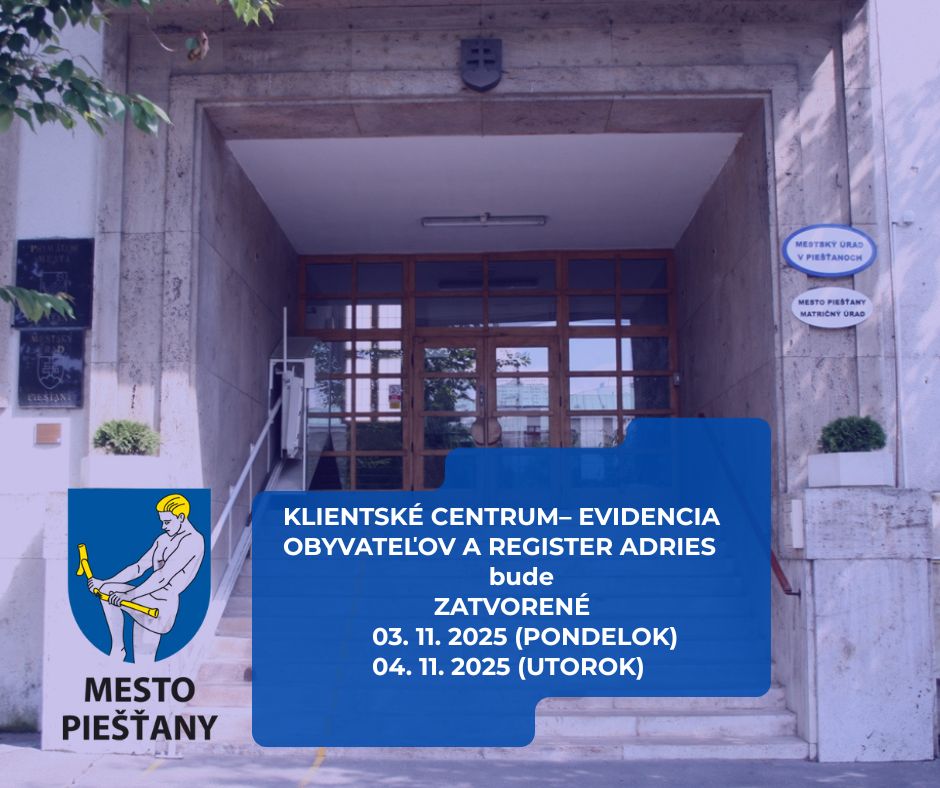 Dňa 03. 11. 2025 (pondelok) a 04. 11. 2025 (utorok) bude z technických dôvodov zatvorená časť Klientského centra – evidencia obyvateľov a register adries. Ďakujeme za pochopenie.