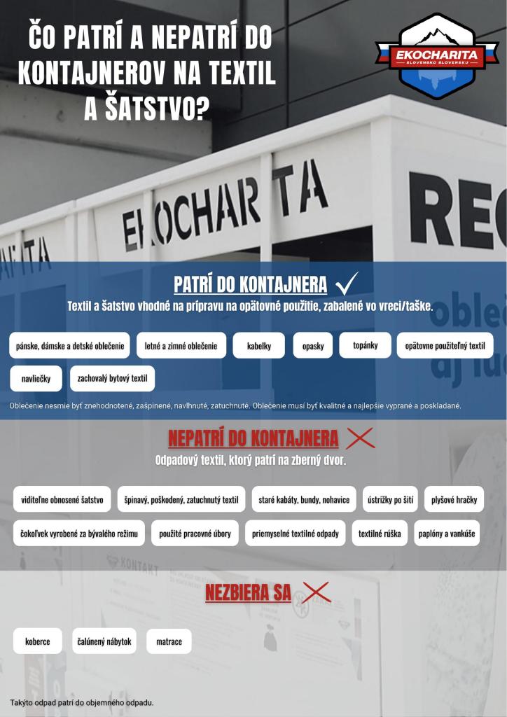 Leták EKOCHARITY so zoznamom vhodných a nevhodných položiek nájdete nižšie v priloženom obrázku. Odporúčame ho preštudovať, aby sme všetci vedeli triediť správne.