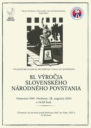 Mesto Piešťany pozýva všetkých občanov na spomienkové stretnutie pri príležitosti 81. výročia Slovenského národného povstania, ktoré sa uskutoční vo štvrtok 28. augusta 2025 o 14:00 hod. na Námestí SNP pri Pomníku „Vďaka osloboditeľom“.
