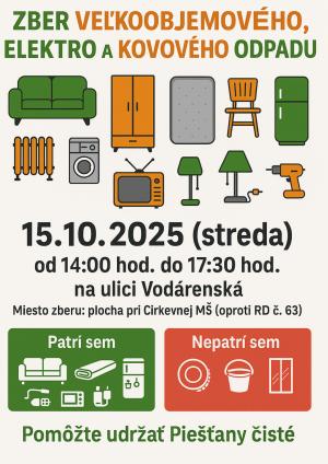 Mesto Piešťany v spolupráci so spoločnosťou BOMAT, Marius Pedersen organizuje zber veľkoobjemového odpadu, elektroodpadu a kovového odpadu, ktorý sa uskutoční na ulici Vodárenská.