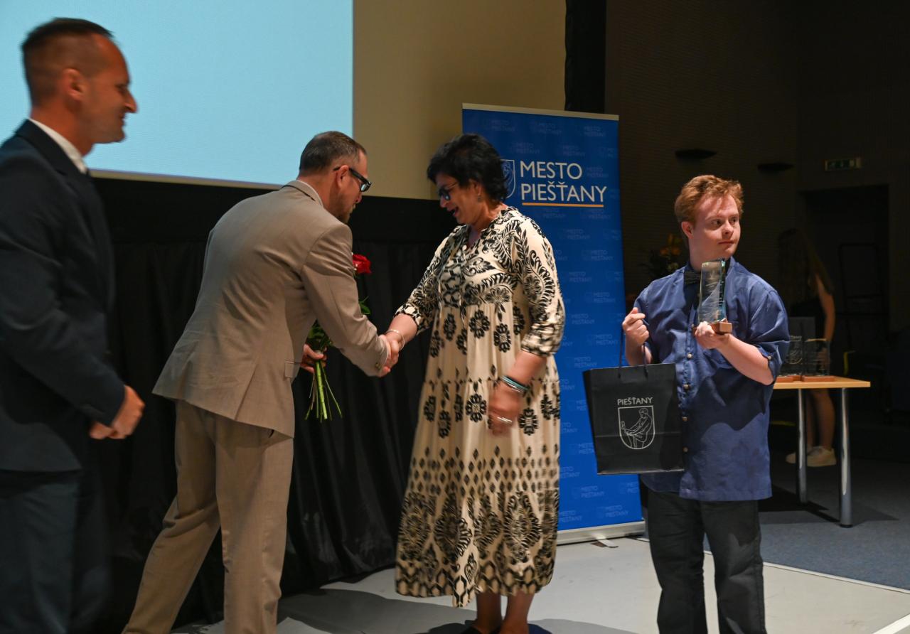 Cenu primátora mesta Piešťany za rok 2024 za aktivity v charitatívnej oblasti si z rúk primátora Piešťan prevzala pani Magdaléna Cebecauerová.