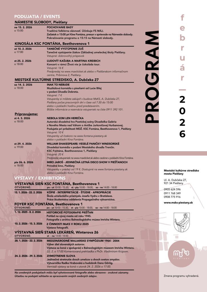Februárový program MsKS Piešťany prináša kombináciu tradície, moderného umenia aj zábavy pre všetky generácie. Aktuálne informácie o podujatiach a vstupenkách nájdete na www.msks-piestany.sk.