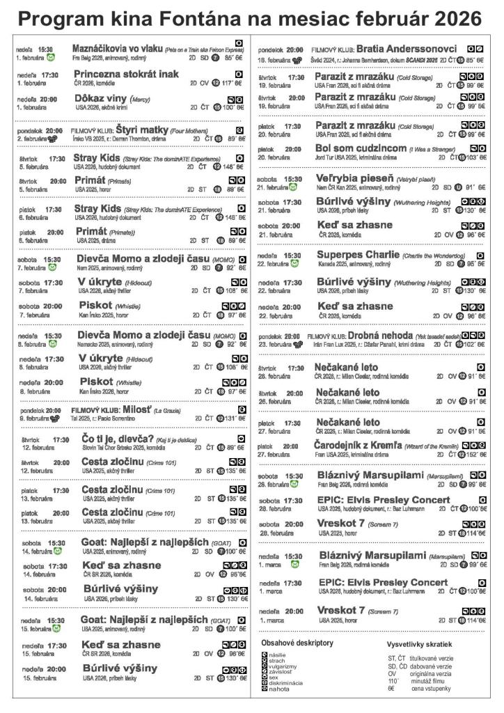 Filmový klub Fontána pokračuje aj vo februári výberom oceňovaných európskych titulov. V pondelok 2. februára uvedie írsku drámu Štyri matky, intímny príbeh spisovateľa, ktorý sa musí postarať o svoju starnúcu matku. O týždeň neskôr, 9. februára, bude na programe film Milosť režiséra Paola Sorrentina s Tonim Servillom v hlavnej úlohe.