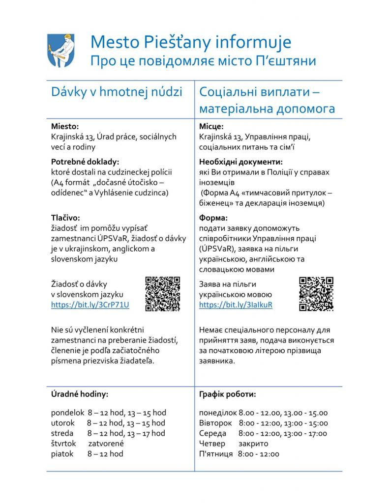 Vytvorili sme preto prehľadný leták so základnými informáciami (aj v ukrajinskom jazyku) ako a kde o tieto dávky žiadať. Pred návštevou Úradu práce je nutné disponovať dokladmi z cudzineckej polície, ktoré sa dajú získať na hraniciach alebo na pobočke v Trnave.