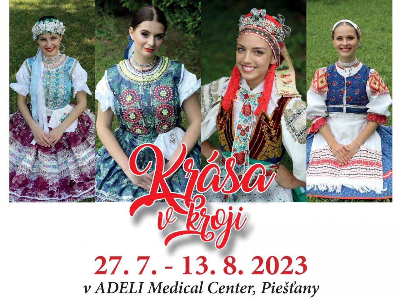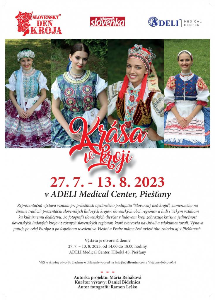 36 fotografií slovenských dievčat v ľudovom kroji zobrazuje krásu a jedinečnosť slovenských ľudových krojov z rôznych slovenských regiónov, ktoré tvorcovia navštívili a zdokumentovali. Výstava putuje po celej Európe a po úspešnom uvedení vo Viedni a Prahe máme česť uviesť túto zbierku aj v Piešťanoch. Výstava bude otvorená denne od 27. 7. do 13. 8. 2023, od 14.00 do 18.00 hod. v ADELI Medical Center, Hlboká 45, Piešťany.