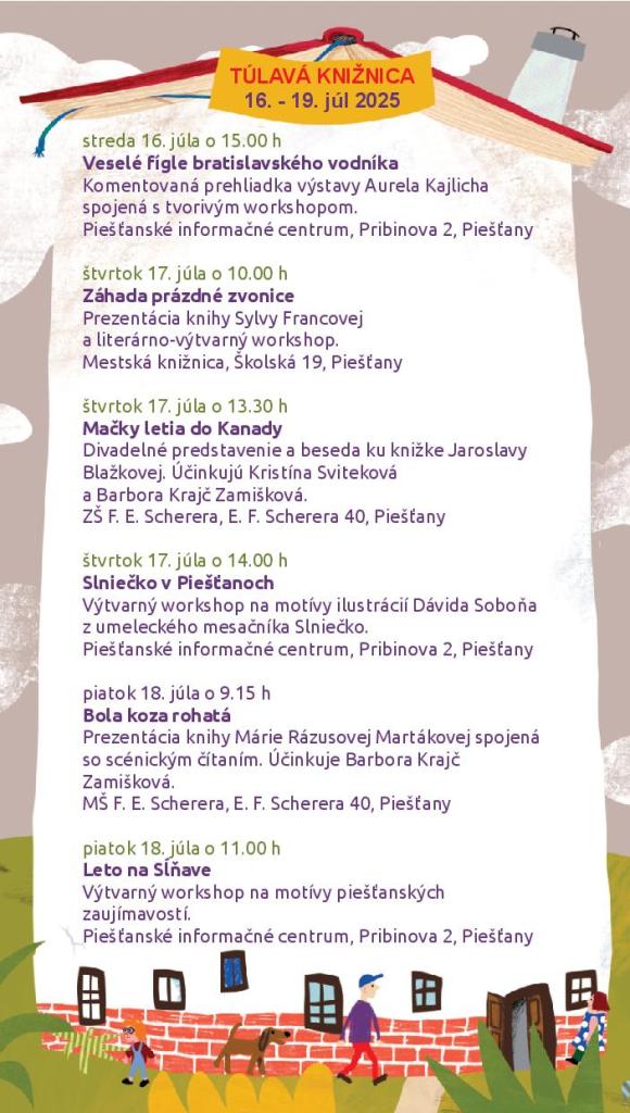 Túlavá knižnica prináša stretnutia s knihou v ambiente mesta a knižnice. Zavítajte na Túlavú knižnicu a spoznajte fígle bratislavského vodníka, Červenú čiapočku, veľrybu Gerdu aj nezbedné dvojičky. Do sveta do sveta kresieb, spomienok a detských dobrodružstiev vás vtiahnu výstavy výtvarníkov a ilustrátorov ako Aurel Kajlich, Dávid Soboň či Mária Nerádová. Vydajte sa s Túlavou knižnicou na kúpeľnú promenádu alebo objavujte krásy Sĺňavy. Navštívte aj výstavy Krehké svety ilustrátorky Marty Matuš a Záhadné obrázkové príbehy Sylvy Francovej.