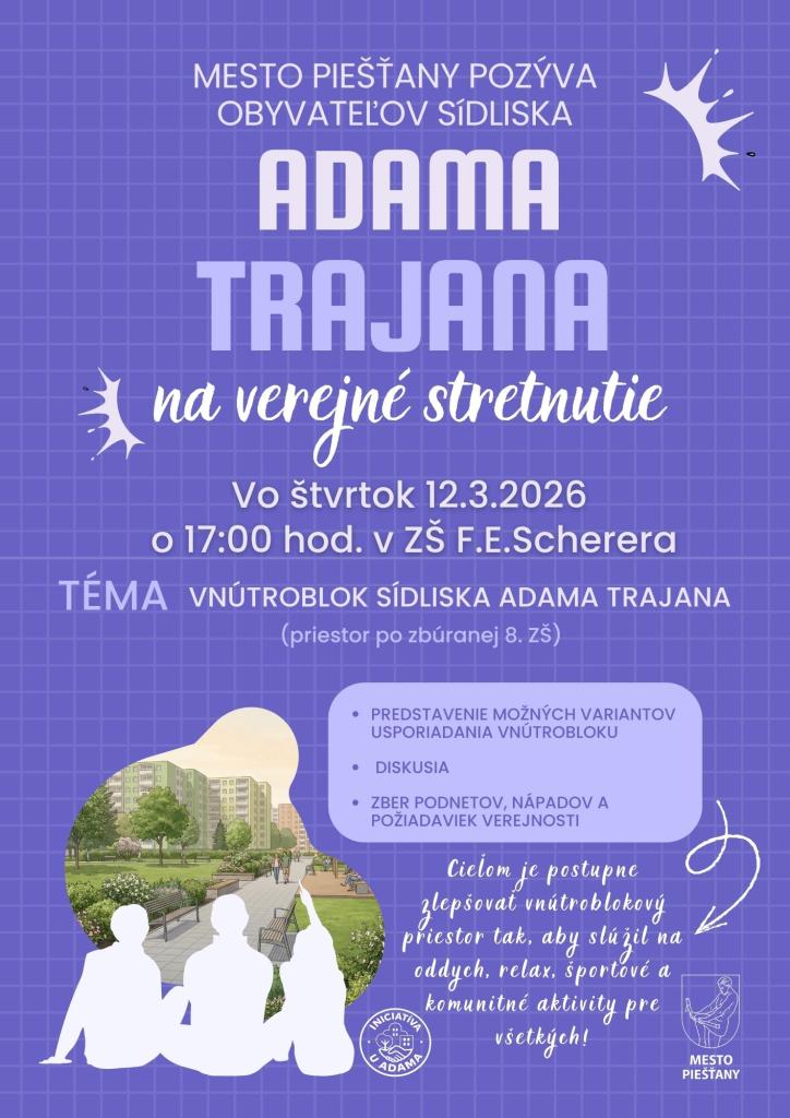 Mesto Piešťany považuje zapojenie verejnosti za dôležitú súčasť prípravy projektu a verí, že spoločným dialógom vznikne verejný priestor, ktorý bude prirodzene slúžiť celej komunite sídliska Adama Trajana.