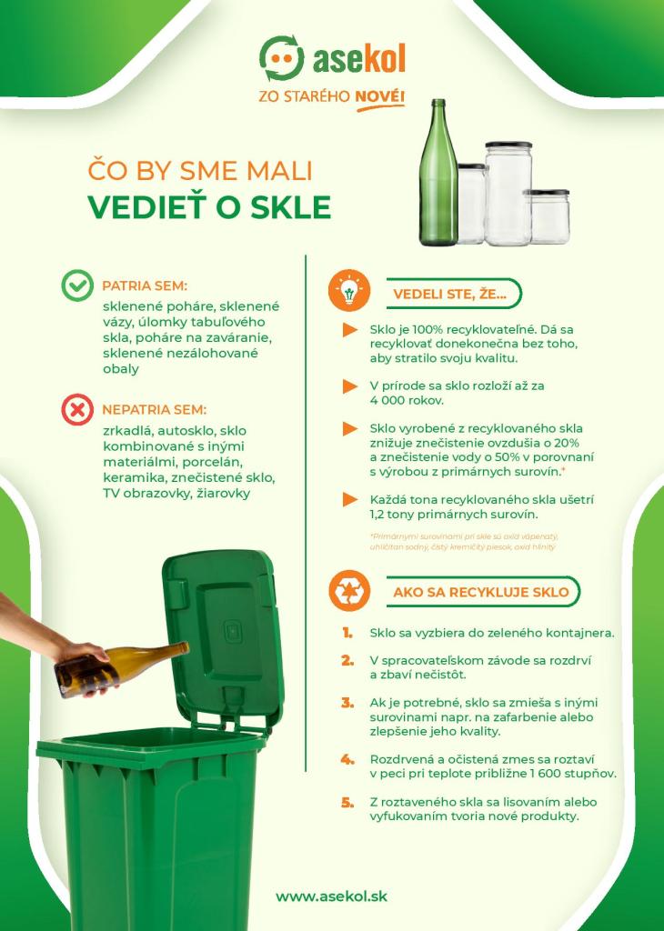 Do skla patria sklenené fľaše, poháre a iné sklenené obaly bez obsahu. Nepatria sem zrkadlá, autosklo, porcelán, keramika ani žiarovky. Sklo je stopercentne recyklovateľné a možno ho spracovávať opakovane bez straty kvality.