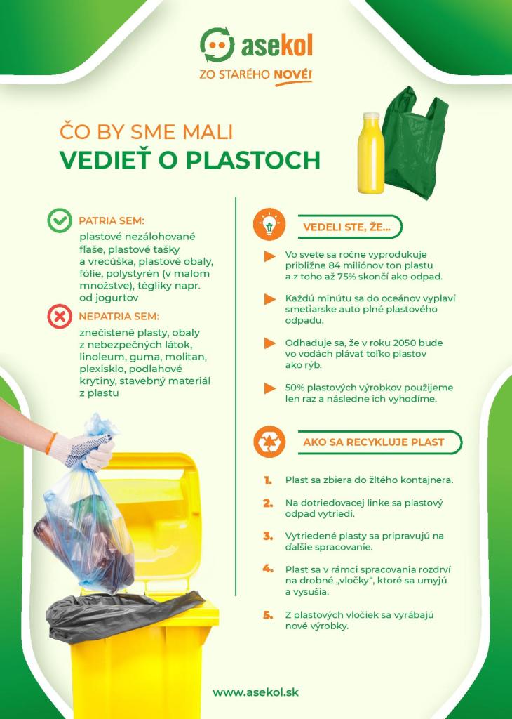 Do plastov patria najmä plastové nezálohované fľaše, plastové tašky a vrecúška, fólie, plastové obaly a kelímky od jogurtov. V mnohých mestách a obciach je zavedený spoločný zber plastov, kovov a nápojových kartónov. Nápojové kartóny (napríklad obaly od mlieka, džúsov či nápojov) sa niekde zbierajú do samostatných oranžových nádob, no častejšie sú súčasťou spoločného zberu a vhadzujú sa do žltých nádob spolu s plastmi.