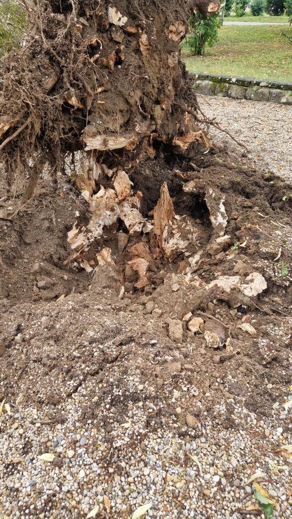 Strom mal výrazne narušenú statiku – došlo k úplnému rozkladu jeho opornej koreňovej sústavy, čo spôsobilo bezprostredné riziko jeho vývratu. Hoci na mieste neboli vizuálne prítomné plodnice huby, práve to je typické pre tento druh patogénu – jeho pôsobenie často prebieha skryto, bez vonkajších príznakov.