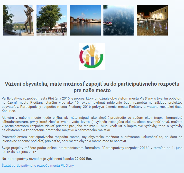 V termíne od 1. júna do 30. júna 2016 môžu obyvatelia mesta predkladať svoje projekty v elektronickej forme na vyššie uvedenú web stránku. V termíne od 6. júla do 24. júla 2016 môžu obyvatelia mesta o predložených projektoch diskutovať a hlasovať.