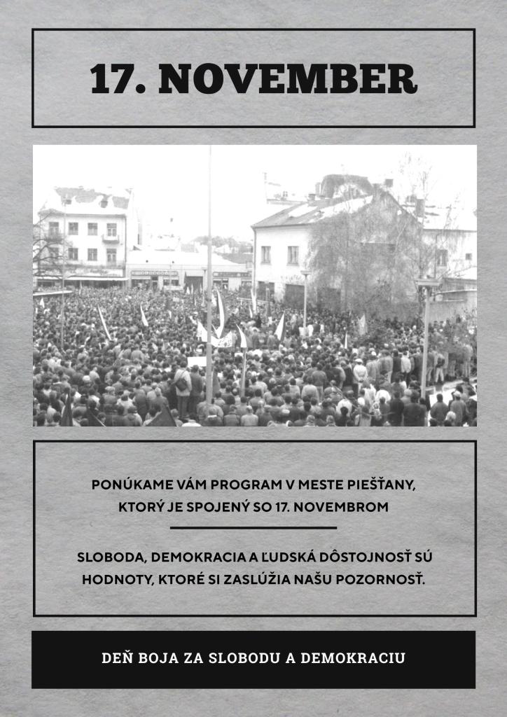 Sloboda, demokracia a ľudská dôstojnosť sú hodnoty, ktoré si musíme chrániť a pripomínať. Mesto Piešťany ďakuje všetkým organizátorom, školám, kultúrnym inštitúciám aj občianskym iniciatívam, ktoré sa podieľajú na podujatiach spojených so 17. novembrom.