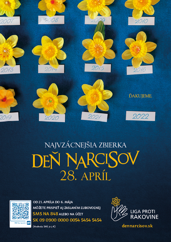 Na Slovensku je veľa vzácnych zbierok. Pre ľudí s rakovinou je však zbierka narcisov tá najvzácnejšia. 28. APRÍLA JE DEŇ NARCISOV. Pripnite si malý kvietok na podporu onkologických pacientov opäť aj v uliciach. Viac o možnostiach prispenia i o tom, ako pomáha Liga proti rakovine, nájdete na www.dennarcisov.sk. Prispieť môžete do 6.5.