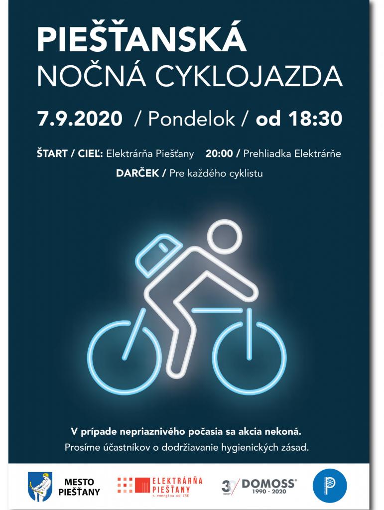 Zraz účastníkov nočnej cyklojazdy je v pondelok 7. septembra 2020 o 18.30 hod. v Elektrárni Piešťany, kde je zároveň štart aj cieľ cyklojazdy. Nenáročná trať vhodná aj pre detských účastníkov dlhá 7,3 km povedie Prednádražím, ulicou Jánošíkova cez Bodonu smerom k Domu umenia, ďalej cez mestský park a ulicou Andreja Hlinku naspäť do Elektrárne.