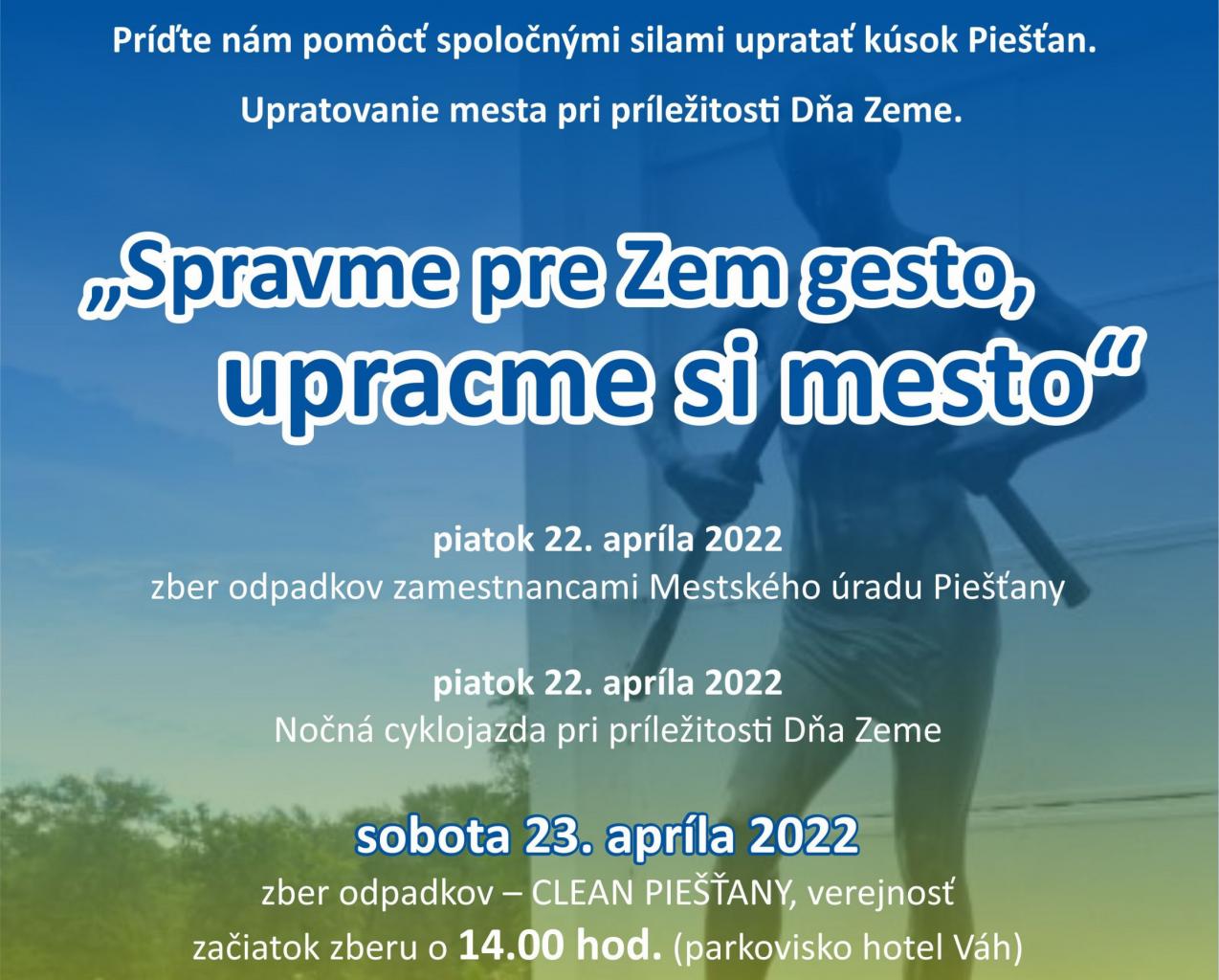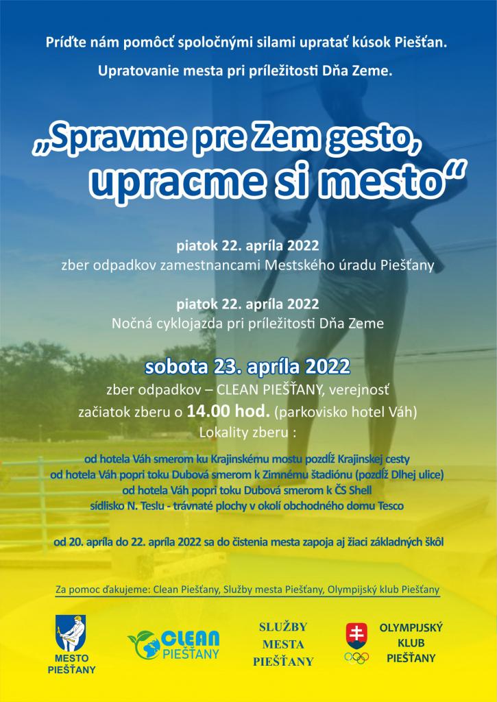 Od 20. do 22. apríla 2022 sa do čistenia mesta zapoja aj žiaci základných škôl. Žiaci a učitelia ZŠ Vajanského, ZŠ Holubyho, ZŠ Mojmírova, ZŠ E. F. Scherera, Cirkevnej spojenej školy a Spojenej školy vyzbierajú odpadky vo viacerých mestských lokalitách.
