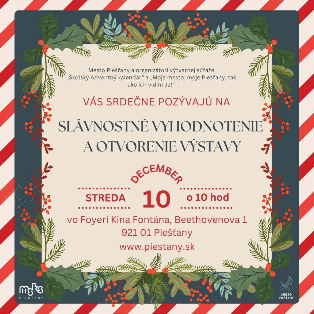 Slávnostné vyhodnotenie oboch súťaží a odovzdanie cien víťazom sa uskutoční 10. decembra o 10:00 vo foyeri Kina Fontána. Súčasťou podujatia bude aj výstava víťazných a vybraných výtvarných prác, ktorá bude sprístupnená verejnosti od 10. decembra 2025 do 10. januára 2026.