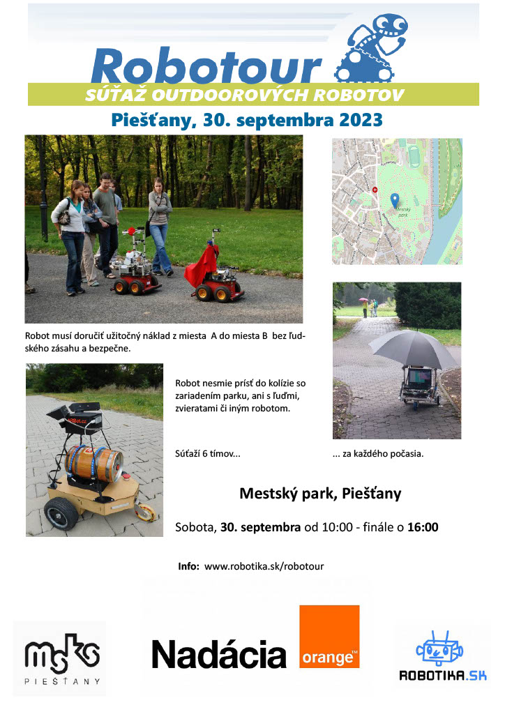 Na 18. ročník súťaže Robotour - outdoor delivery challenge vás pozývajú Robotika.sk v spolupráci s Mestským kultúrnym strediskom Piešťany a partnerskou organizáciou Robotika.CZ.