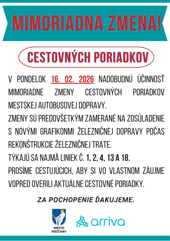 S účinnosťou od pondelka 16. februára 2026 dochádza k viacerým zmenám cestovných poriadkov na vybraných linkách mestskej autobusovej dopravy (MAD) v Piešťanoch.