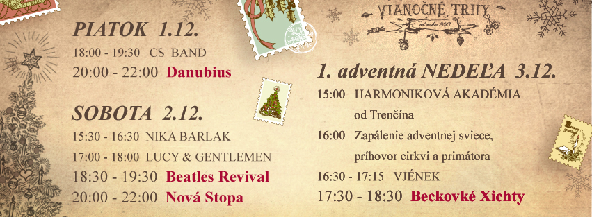 PIATOK 18:00-19:30 CS BAND 20:00-22:00 DANUBIUS SOBOTA 15:30-16:30 NIKA BARLAK 17:00-18:00 LUCY&GENTLEMEN 18:30-19:30 BEATLES REVIVAL 20:00-22:00 NOVÁ STOPA NEDEĽA 15:00 HARMONIKOVÁ AKADÉMIA 16:00 Zapálenie adventnej sviece 16:30-17:15 VJÉNEK 17:30-18:30 BECKOVSKÉ XICHTY
