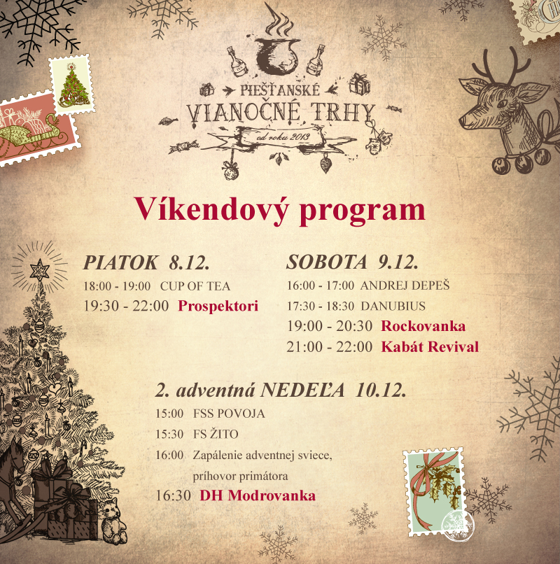 PIATOK 18:00 - 19:00 CUP OF TEA 19:30 - 22:00 PROSPEKTORI SOBOTA 16:00 - 17:00 ANDREJ DEPEŠ 17:30 - 18:30 FÁZA 19:00 - 20:30 ROCKOVANKA 21:00 - 22:00 KABÁT Revival NEDEĽA 15:00 FSS POVOJA 15:30 FS ŽITO 16:00 Zapálenie 2. adventnej sviece, čaj primátora 16:30 - 18:30 DH MODROVANKA