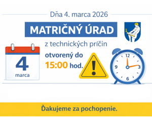 Mesto oznamuje občanom, že dňa 4. marca 2026 bude Matričný úrad z technických príčin otvorený iba do 15:00 hod.